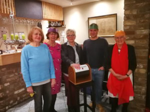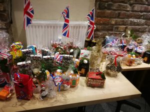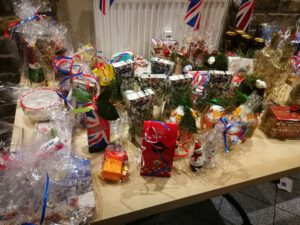 Die Veranstalltung war mit ca. 40 Personen gut besucht. Nach dem weihnachtlichen Essen fand die mit Vorfreude erwartete ‘raffle‘ nach englischem Muster statt (raffle = Verlosung bzw. Tombola) . Der Losverkauf lief gut. Die Personen an der Lostrommel, in englischen Outfit, zogen dann die Lose. Der Jubel am Tisch war immer gr0ß, wenn ein Tischnachbar ein Glückslos erworben hatte und er freudig seinen Gewinn, ein Glas Marmelade, einen Kerzenleuchter, Kekse oder ähnliches an den Tisch brachte.